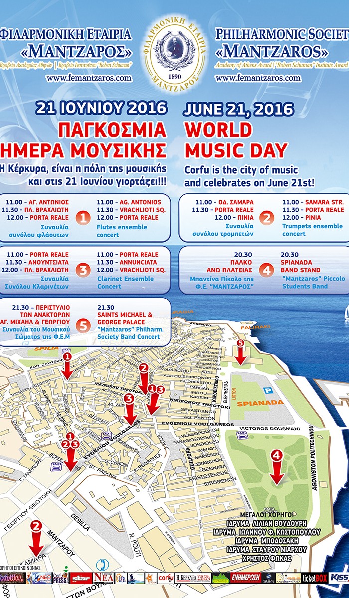 Στις 21 Ιουνίου 2016, από τις 11:00 π.μ. μέχρι τις 23:00 μ. μ. για τέταρτη συνεχόμενη χρονιά, μουσικά σύνολα, μαθητική μπαντίνα και η μπάντα της Φιλαρμονικής, θα δώσουν συναυλίες σε κεντρικά σημεία της πόλης, θυμίζοντάς μας, ότι παρά τις δυσκολίες, η «Πόλη της Μουσικής» … γιορτάζει!!!