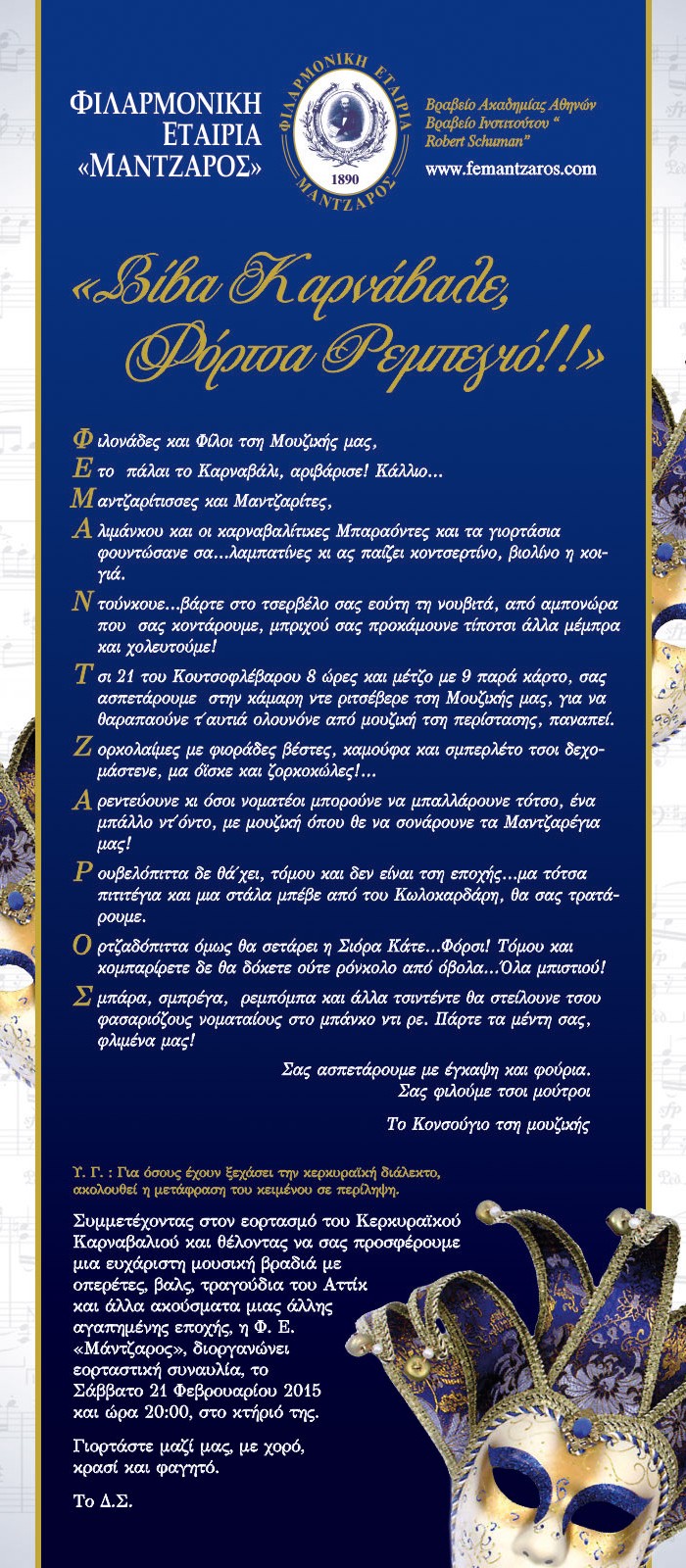 Συμμετέχοντας στον εορτασμό του Κερκυραϊκού Καρναβαλιού και θέλοντας να σας προσφέρουμε μια ευχάριστη μουσική βραδιά με οπερέτες, βαλς, τραγούδια του Αττίκ και άλλα ακούσματα μιας άλλης αγαπημένης εποχής, η Φ. Ε. «Μάντζαρος», διοργανώνει εορταστική συναυλία, το Σάββατο 21 Φεβρουαρίου 2015 και ώρα 20:00, στο κτήριό της.